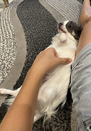 Meet Indigo, a long haired Chihuahua. Unlike her brothers, Indigo isn’t the biggest fan of new people. When I first met Indigo, she wasn’t buying what I was selling. The treats were not good enough for her!